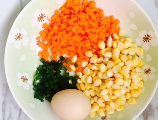 主料:甜玉米半根,面粉30 克,鸡蛋1 个,胡萝卜半根,辅料:盐、葱少许。