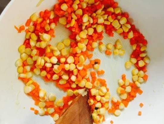 胡萝卜切小粒,玉米掰成颗粒。 锅里加点油,把胡萝卜和玉米粒炒熟。