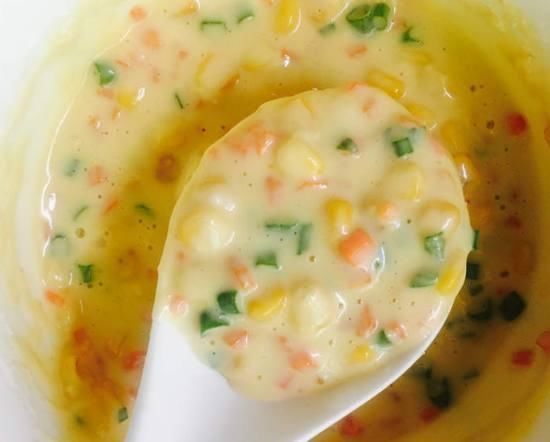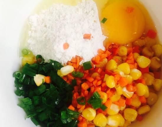 碗里放入面粉,鸡蛋,炒熟的胡萝卜玉米粒,葱花,盐,加水用筷子和成面糊。